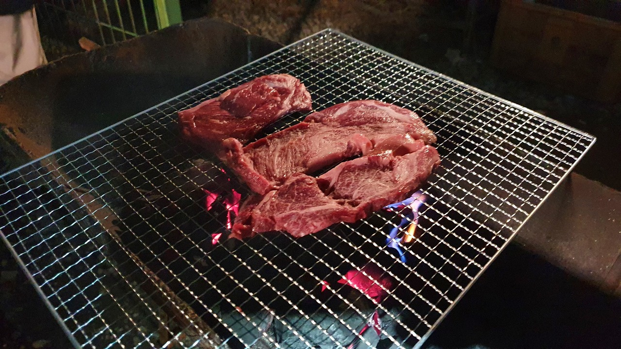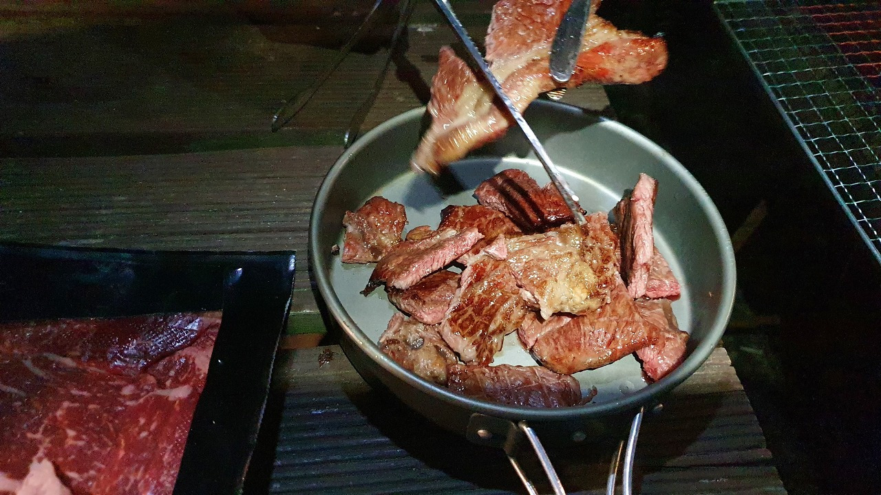 이제 숯불이 준비되었으니 숙성한우를 그릴에 얹어봅시다. 24시간 낚시니까 첫 끼니인 저녁은 당연히 한우로 시작하겠습니다. 이때, 어떤 고기든 한우는 다 이기는 맛이 있습니다. 그런데 이번에는 이베리코 꽃 목살도 준비해 봤습니다. 이베리코 꽃 목살을 한우와 함께 그릴에 올렸습니다.