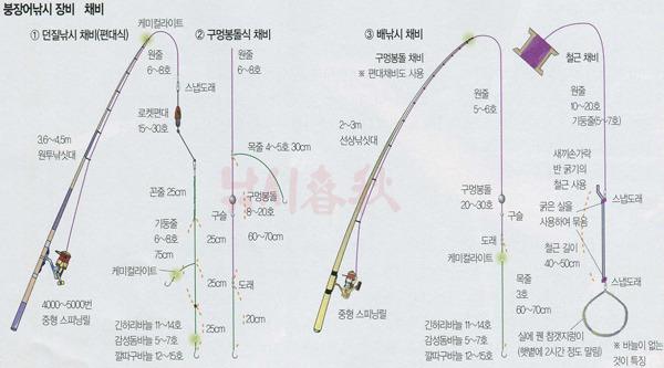 - 배낚시채비: 원줄은 나일론 5-6호, 목줄은 3호를 사용합니다.